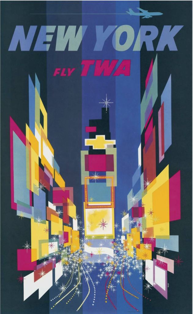 ‘This is a reproduction of a New York Fly TWA poster issued by Trans World Airlines (TWA). It features an iconic design by the renowned American artist David Klein’