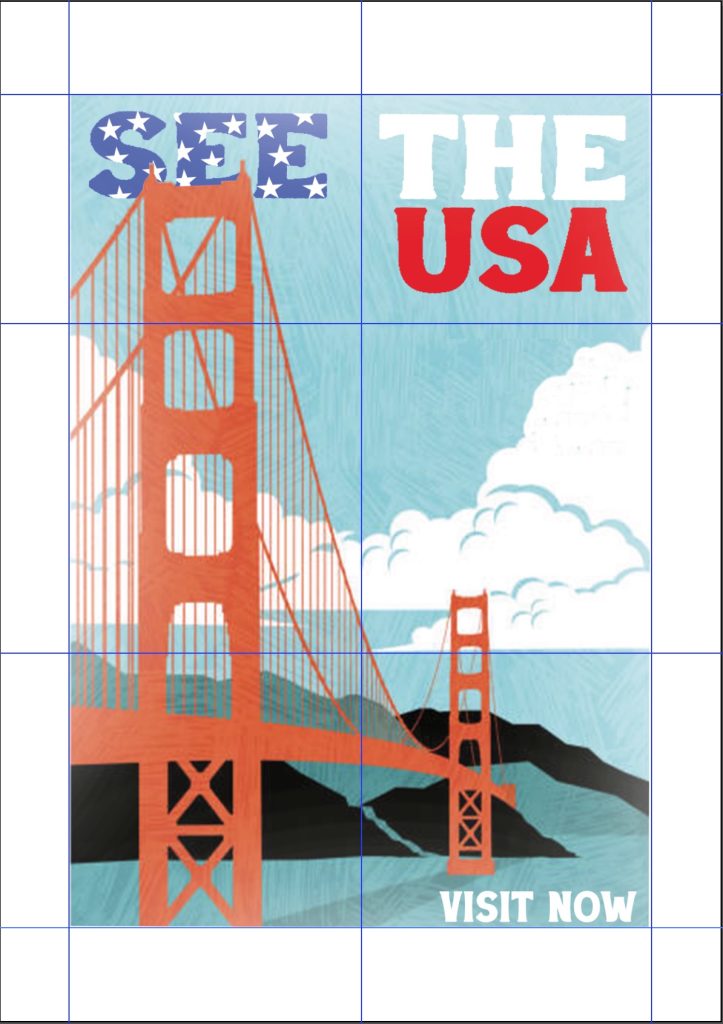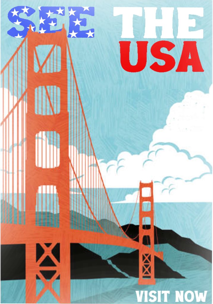 This Poster I find this to lack movement and although it seems the author has implemented a darker backdrop and a bright vocal point it does not have an impactful meaning and you don’t engulf the information that it’s trying to tell as there’s too much going on at the booth of the poster and you don’t tend to focus on the typography of the poster and that what matter in a poster as such that is promoting that the viewer visit USA. The composition seems to be all around the place you have one element on its own followed by another scattering the viewer all over the page with a focus on the bright orange contrast.