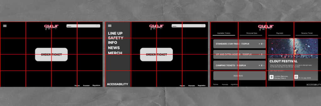 As I previously mentioned the area of concern was the accessibility section and the inclusion of additional information as some users may require it. However, I was apprehensive about losing sight of the website’s primary objectives, particularly since users primarily visit the site to purchase tickets, which is the key feature we can argue is the most significant. Therefore, I ensured that the call-to-action button remains prominently positioned in the centre with a strong contrast against the background (colour details will be discussed in a later post) to capture the user’s full attention. If users wish to access more information they can click on the three horizontal lines in the top left corner which will reveal a small submenu that allows for further exploration with more detailed information regarding CLOUT Festival.