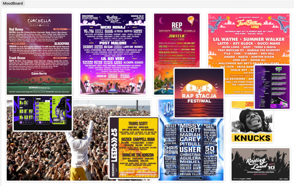 While gathering images for the mood board, it was observed that the typography used in music festivals showcased a wide range of styles. The overall atmosphere of each festival greatly impacted the typography choices. Nevertheless, all selected fonts were bold and eye-catching, regardless of the genre, and this approach will be reflected in the branding for my CLOUT Festival as it sems as the most important aspect when it come to the visual aspect.