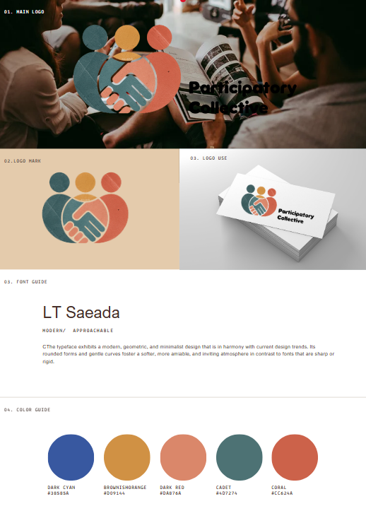 The main focus going forward when I started making visual choices was to ensure that the mission of the participatory collective wasn’t lost. So, I began collecting typefaces that I thought were both approachable and soft, yet also modern, trying to create a gentle foundation for the possible designs that would come from it. The final typeface I chose is LT Saeada, which is a geometric sans-serif font that is modern, rounded, and friendly, designed to combine contemporary style with a sense of warmth. Created by LyonsType, it has clean, minimalistic letterforms with soft curves. The name “Saeada” translates to “happiness” in Arabic, and its design uniquely combines rounded tops with square bottoms.