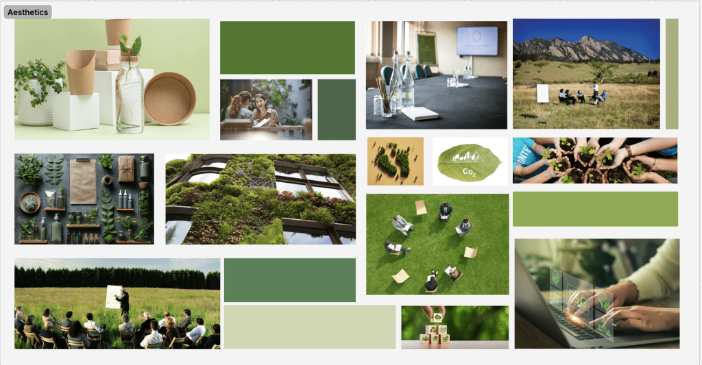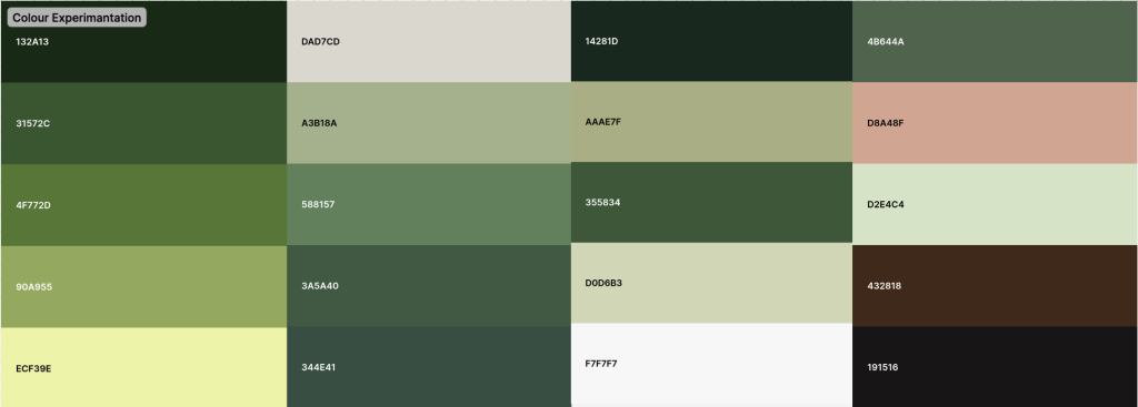 I began to explore and experiment with various earthy tones particularly greens as they predominantly signify feelings of tranquility, safety, and a profound connection to nature. These colors elicit a sense of warmth and grounded sophistication which has contributed to their popularity in design and fashion effectively conveying core values immediately through the colors as this will be the first aspect that the audience perceives.