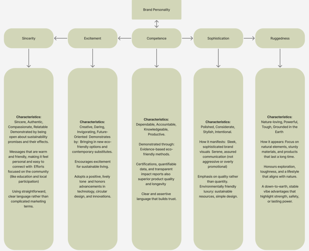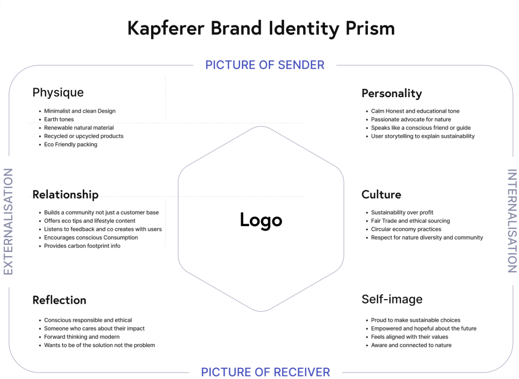 Brand personality characterises the human attributes and tone of a brand directing its visual representation and communication style. The brand identity prism serves as a framework for organising a brand’s values, aesthetics, and customer interactions thereby ensuring uniformity and clarity throughout all design and communication channels.